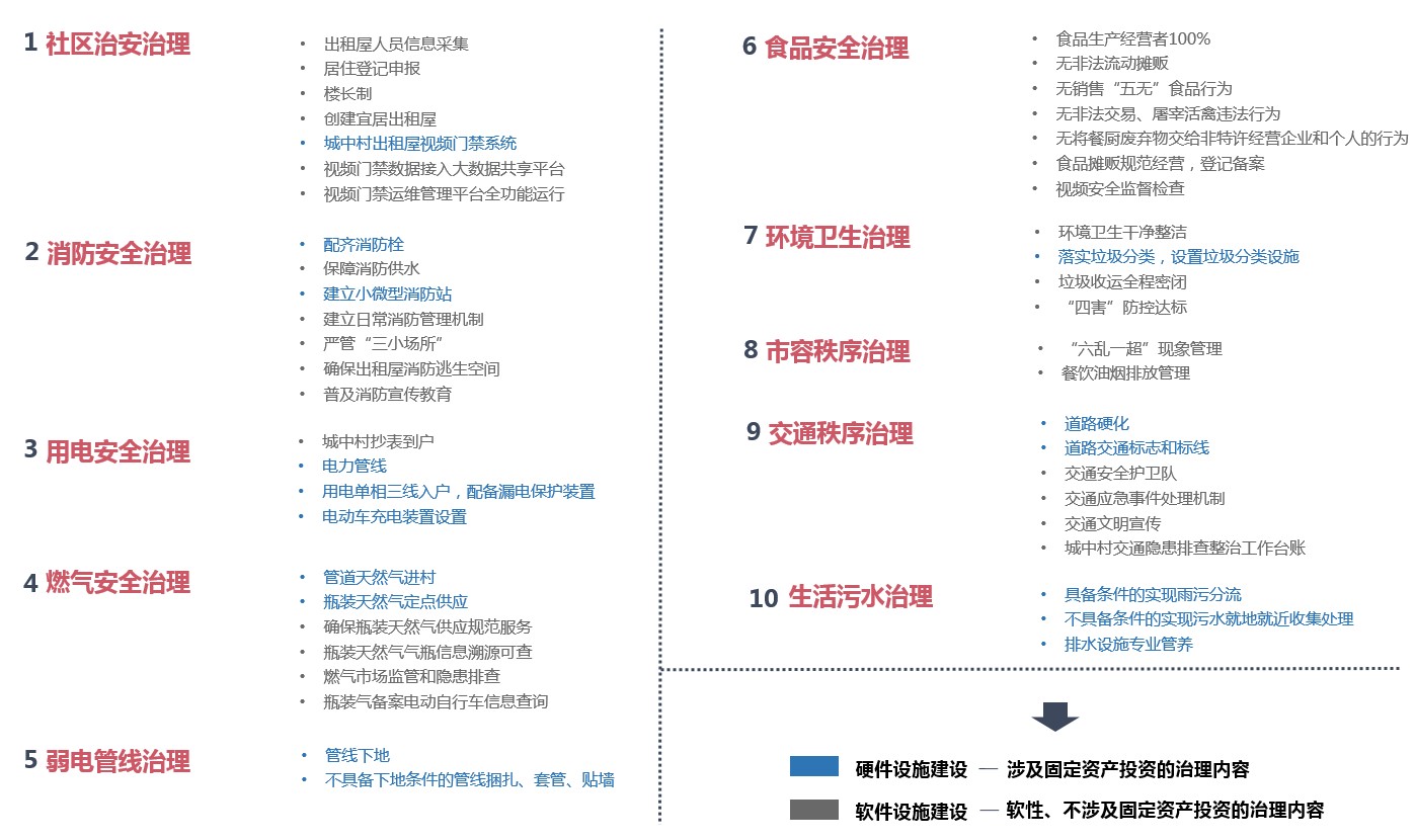 为居民者治:我们拟定了城中村社区治安治理、消防安全治理、用电安全治理、燃气安全治理、食品安全治理、弱电管线治理、环境卫生治理、市容秩序治理、交通秩序治理和生活污水治理等十大治理行动的空间范围、主要内容、责任分工和实施路径,为居民建设安全、干净、有序、和谐的文明的幸福家园。