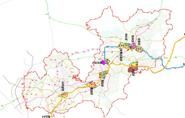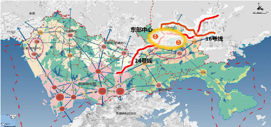 同时,在粤港澳大湾区和深圳东进战略的发展背景下,龙岗区已迎来轨道交通建设高增长期。14号线、16号线于 2018 年初开工,轨道建设工作日益加快,深港国际中心、大运枢纽、东部科创总部基地等重大项目同步推进。但是现有规划难以引导站城一体开发、协调周边土地利益统筹,在规划实施过程中出现空间耦合度不高、土地利用不集约、轨道建设与土地开发时序失衡等问题。因此,亟需政府搭建平台,建立轨道建设与城市开发的前提与共识。为抓住跨越发展的重大契机,前瞻性地指导龙岗区轨道交通站城一体化开发,在“框架协议”和“强区放权”改革措施指导下,龙岗区轨道办先行先试,开展了《龙岗近期实施重点站点站城一体开发研究、大运枢纽站城一体统筹研究及详细设计》规划研究项目公开招标工作。
