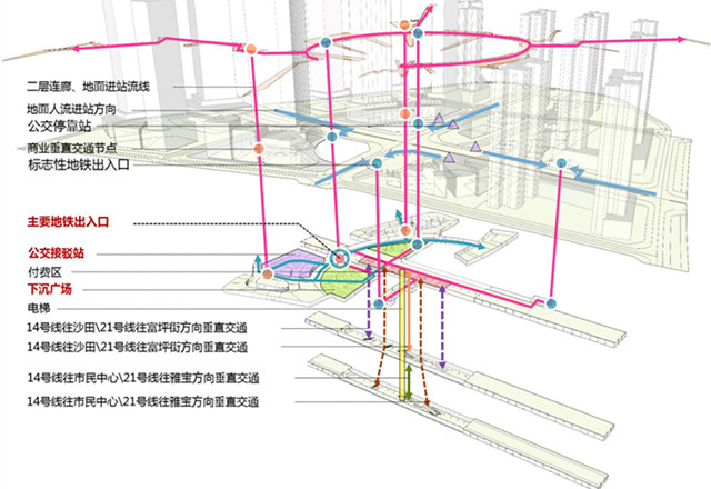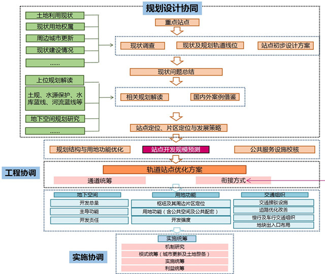 1、厘清站点优化思路,梳理站点优化需求;划分站点优化类型,实现站点精准优化。将城市基面对城市空间进行水平和垂直方向综合开发,强调精细化布置下穿轨道、立体人车分流动线、多首层服务设施和上盖高层建筑核心筒,通过预留结构、荷载与通道接口等进行前瞻式开发,形成有序、立体复合的空间网络型城市。